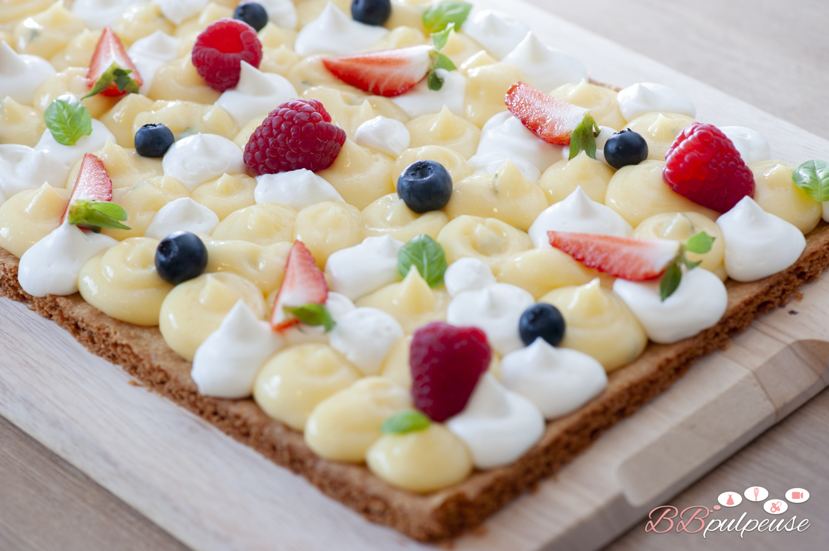 Aujourd’hui c’est avec grand plaisir que je vous partage cette tarte printanière. Elle est constituée d’un sablé breton, recouvert d’une crème au citron parfumée au basilic, et d’une chantilly mascarpone, le tout décoré avec de jolies fraises, framboises et myrtilles.